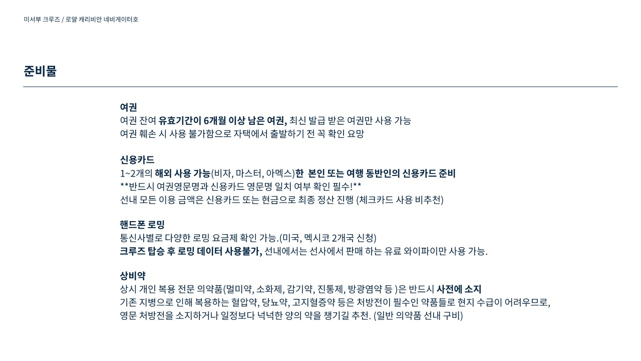개인지출비용, 선내 유료시설 이용료, 개인매너팁, 선상팁 8만원, 유류할증료 및 TAX 35만원, 발코니추가 50만원, 일정추가 35만원, ESTA 발급비 별도 5만원